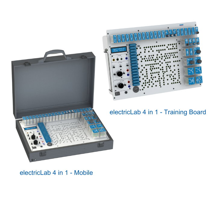Mit unserem electricLab 4 in 1 können Sie die Grundlagen zu den Themen der Gleichstrom- und Wechselstromtechnik, Elektronik und Dreiphasenwechselstrom vermitteln. Ob Schule, Berufsschule oder betriebliche Ausbildung, das electricLab 4 in 1 unterstützt Sie optimal im Ausbildungsalltag.