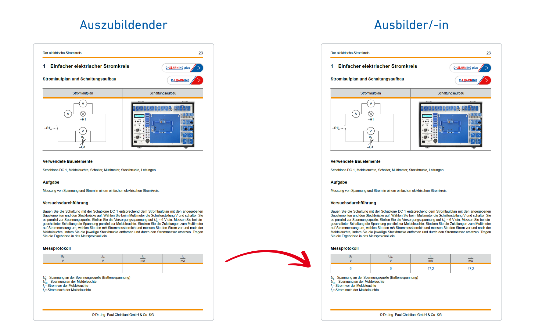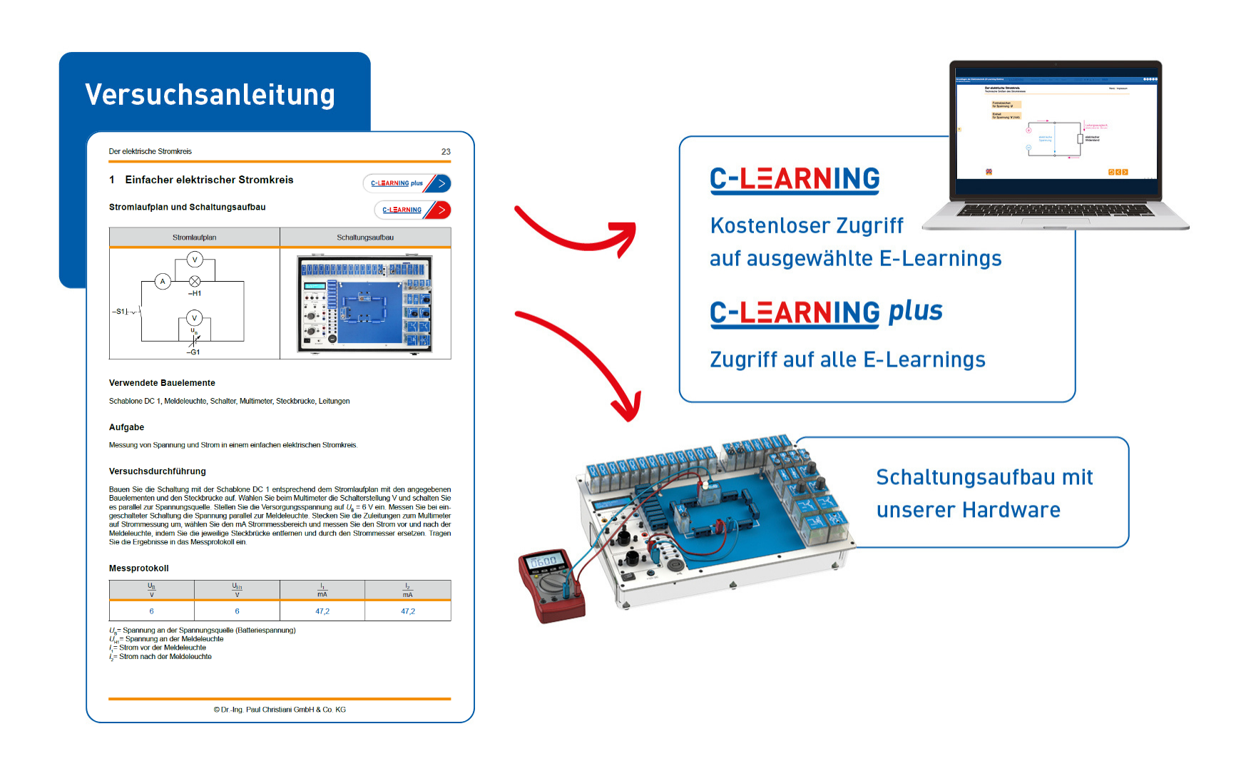 Die passenden Versuchsanleitungen mit einem Umfang von 300 Seiten werden digital auf unserem Lernportal C-LEARNING zur Verfügung gestellt.